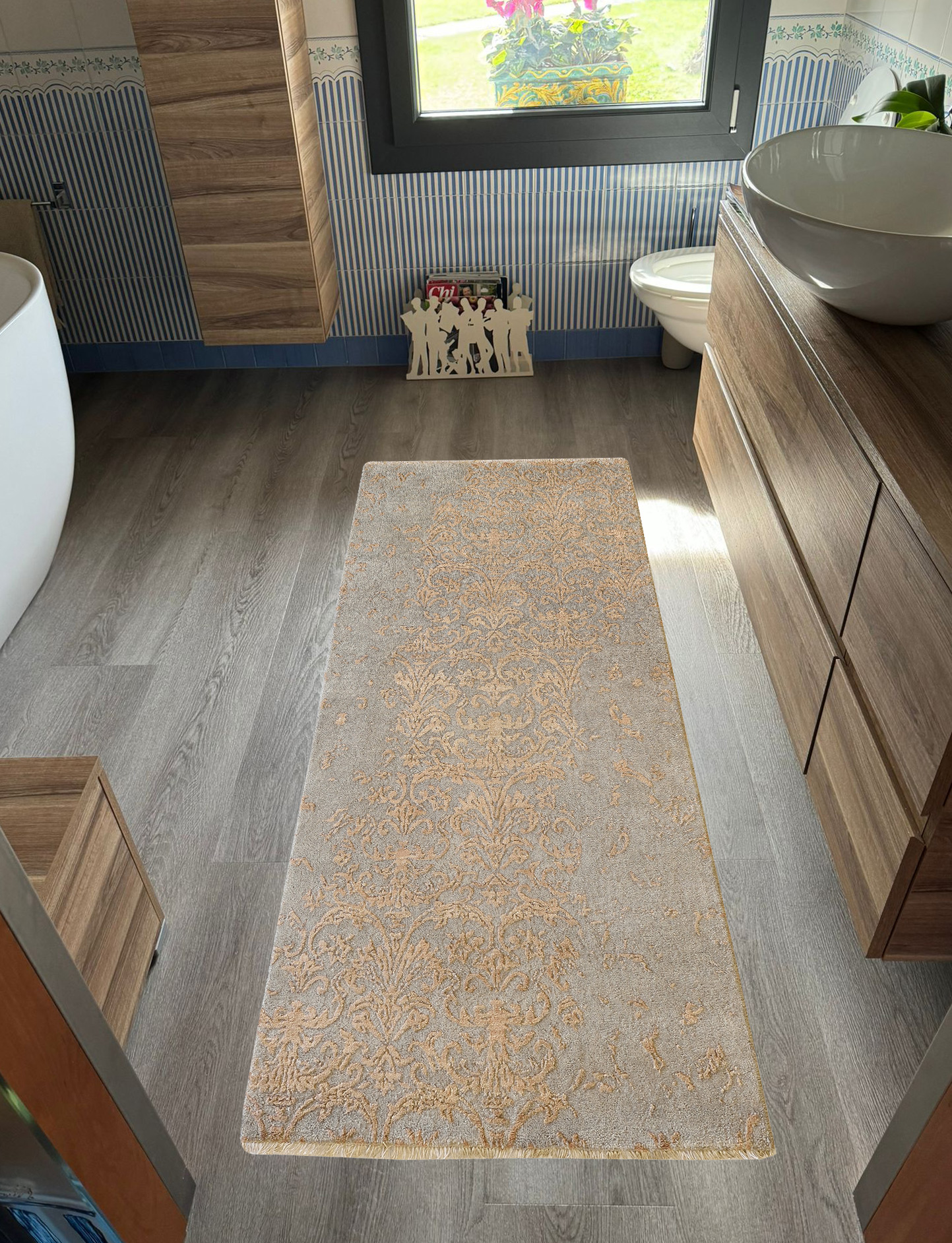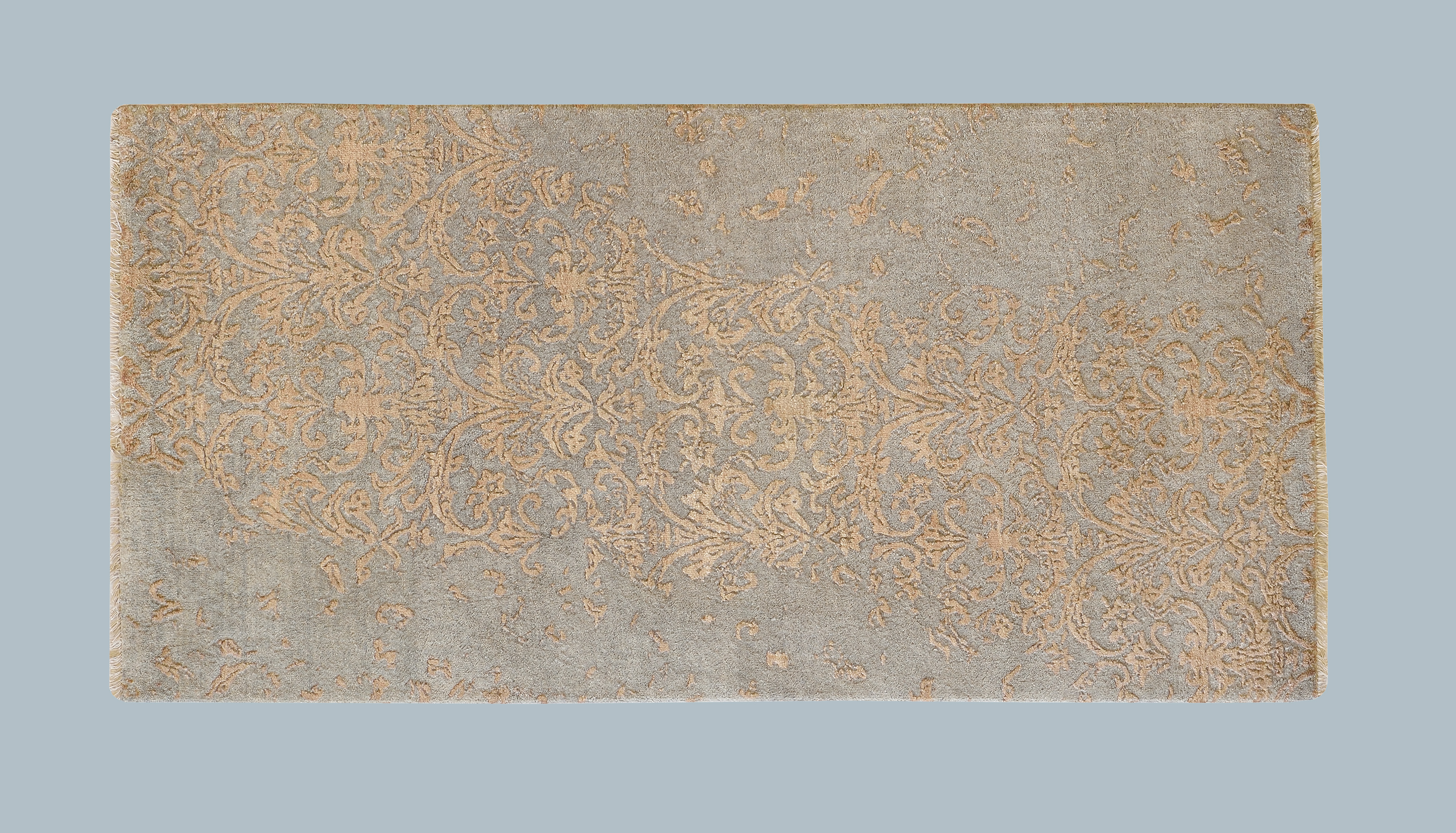 Rara e ricercata misura del tappeto, annodato nella splendida qualità della collezione Bhadohi, ci propone il famoso disegno a cascata di fiori di damasco realizzato in color oro chiaro su fondo grigio traslucido.