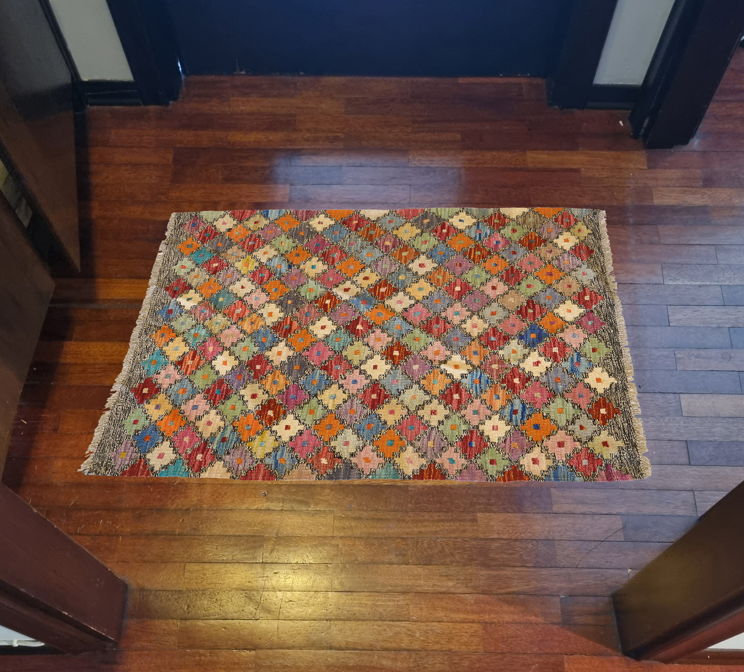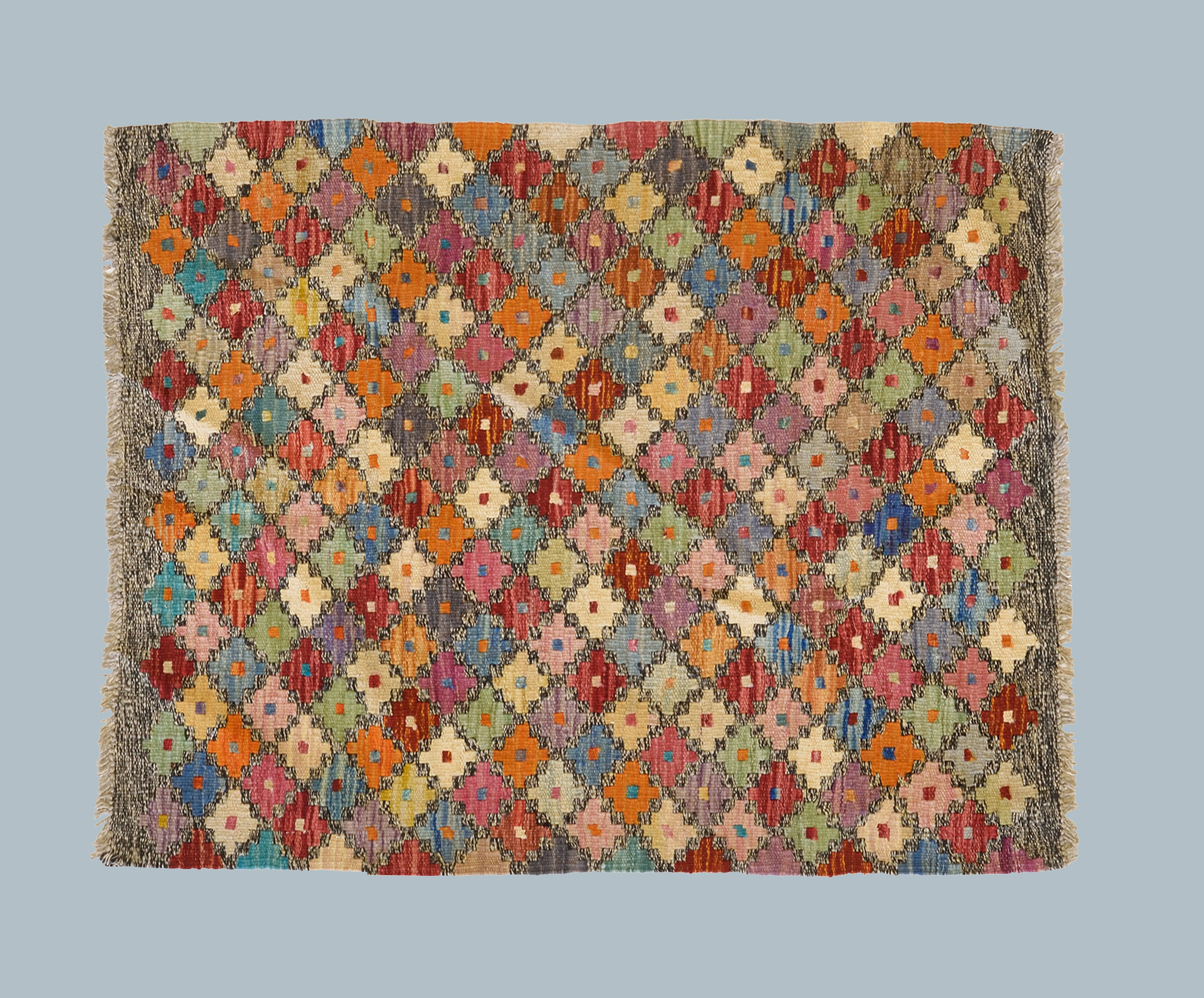 Intrecciati prevalentemente in Afganistan con nuovi colori vivaci o a pastello, riprendono tutti i motivi arcaici tramandati da secoli di generazione in generazione. I kilim nuovi sono una tessitura manuale piana realizzata con tecnica a stacchi; questa prevede che i fili di trama dello stesso colore passino sopra un ordito comune, lo avvolgano e tornino indietro lasciando una fessura che crea una separazione netta tra i blocchi di colore.I diversi blocchi danno origine a disegni geometrici, a questi motivi le tessitrici danno aspetto ornamentale o di talismani simbolici. Ad esempio, i motivi dei kilim nuovi noti con il nome di Elibelinde, sono una figura antropomorfica di dea, simbolo di nascita, spesso rappresentata in forma facilmente riconoscibile, addirittura a volte rappresentata con il figlio in grembo.I kilim nuovi con motivi Bukagi, passatoia per animali, Yin-yang (originari del lontano oriente), Su yolu acqua che corre, Muska amuleto contro il malocchio. Infinità di motivi combinati tra loro in modo fantasioso ed originale danno luogo a forme decorative e colori armonici che attraggono piacevolmente la nostra attenzione.I kilim nuovi appagando il nostro piacere estetico contemporaneo ci tramandano una storia secolare di comunicazione grafica ed una simbologia densa di significati. Ecco altri motivi tipici che anche in queste nuove manifatture ci tramandano una cultura secolare.Motivi ricorrenti nei Kilim nuovi: Cencel ad uncino, motivi a testa di uccello, a scorpione con motivo Akrep, motivi Yildiz, Agaci, Kus, Nazarlik, Kupe, Bukagi, sono inseriti tra le forme romboidali o a medaglione, in bordura o all'interno del campo del kilim.