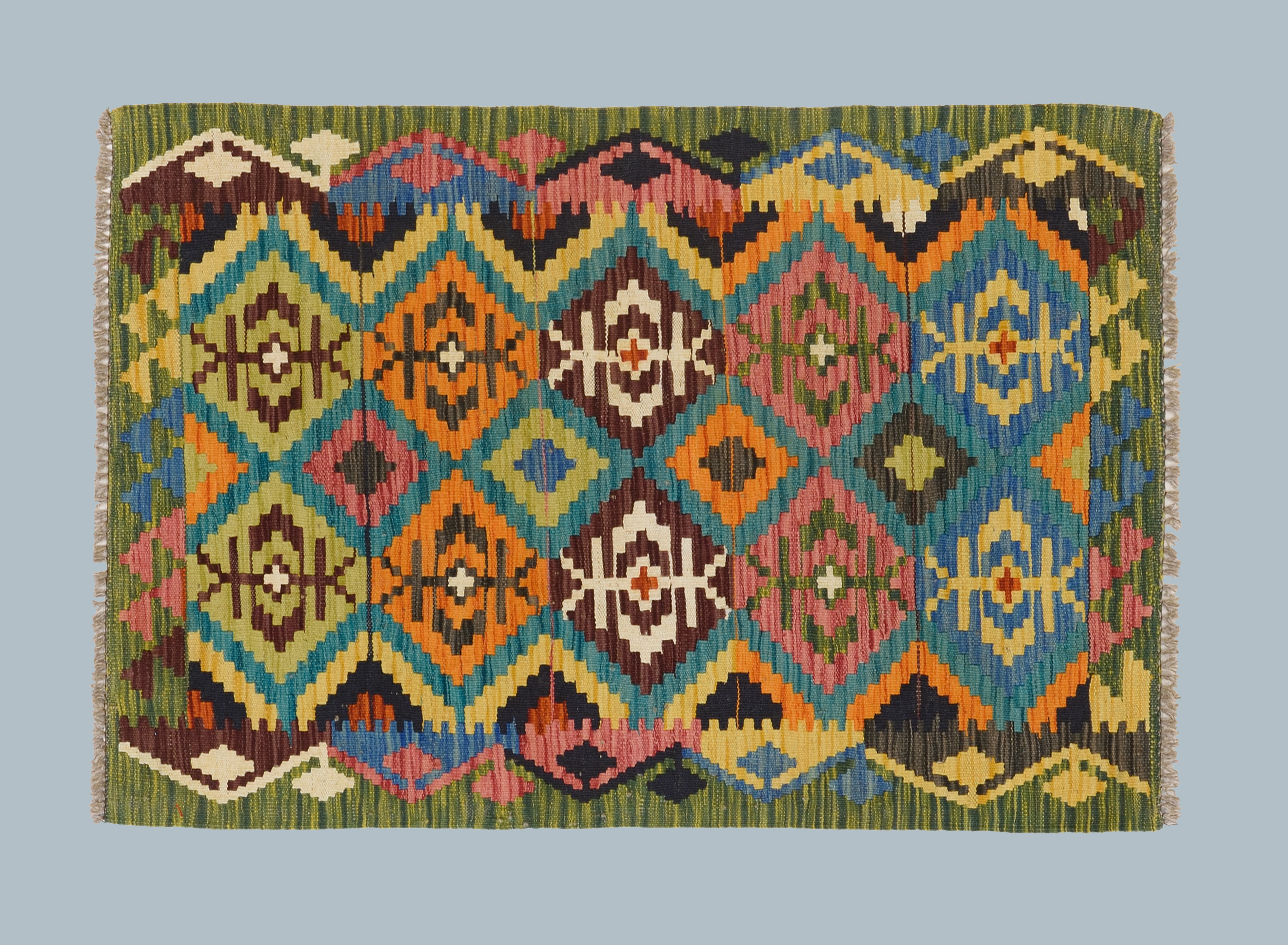 Intrecciati prevalentemente in Afganistan con nuovi colori vivaci o a pastello, riprendono tutti i motivi arcaici tramandati da secoli di generazione in generazione. I kilim nuovi sono una tessitura manuale piana realizzata con tecnica a stacchi; questa prevede che i fili di trama dello stesso colore passino sopra un ordito comune, lo avvolgano e tornino indietro lasciando una fessura che crea una separazione netta tra i blocchi di colore.I diversi blocchi danno origine a disegni geometrici, a questi motivi le tessitrici danno aspetto ornamentale o di talismani simbolici. Ad esempio, i motivi dei kilim nuovi noti con il nome di Elibelinde, sono una figura antropomorfica di dea, simbolo di nascita, spesso rappresentata in forma facilmente riconoscibile, addirittura a volte rappresentata con il figlio in grembo.I kilim nuovi con motivi Bukagi, passatoia per animali, Yin-yang (originari del lontano oriente), Su yolu acqua che corre, Muska amuleto contro il malocchio. Infinità di motivi combinati tra loro in modo fantasioso ed originale danno luogo a forme decorative e colori armonici che attraggono piacevolmente la nostra attenzione.I kilim nuovi appagando il nostro piacere estetico contemporaneo ci tramandano una storia secolare di comunicazione grafica ed una simbologia densa di significati. Ecco altri motivi tipici che anche in queste nuove manifatture ci tramandano una cultura secolare.Motivi ricorrenti nei Kilim nuovi: Cencel ad uncino, motivi a testa di uccello, a scorpione con motivo Akrep, motivi Yildiz, Agaci, Kus, Nazarlik, Kupe, Bukagi, sono inseriti tra le forme romboidali o a medaglione, in bordura o all'interno del campo del kilim.