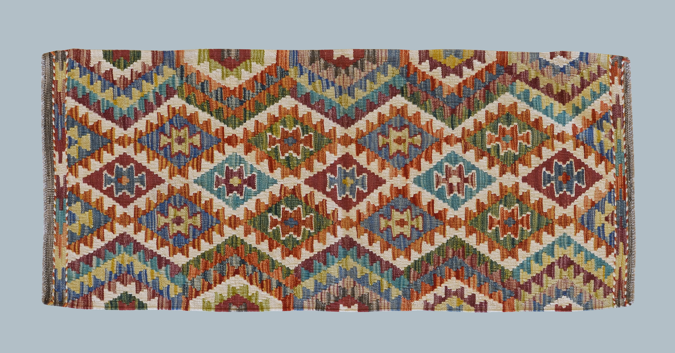 Kilim dal formato allungato, colori intensi e motivo principale che origina dal villaggio serbo di Pirot.