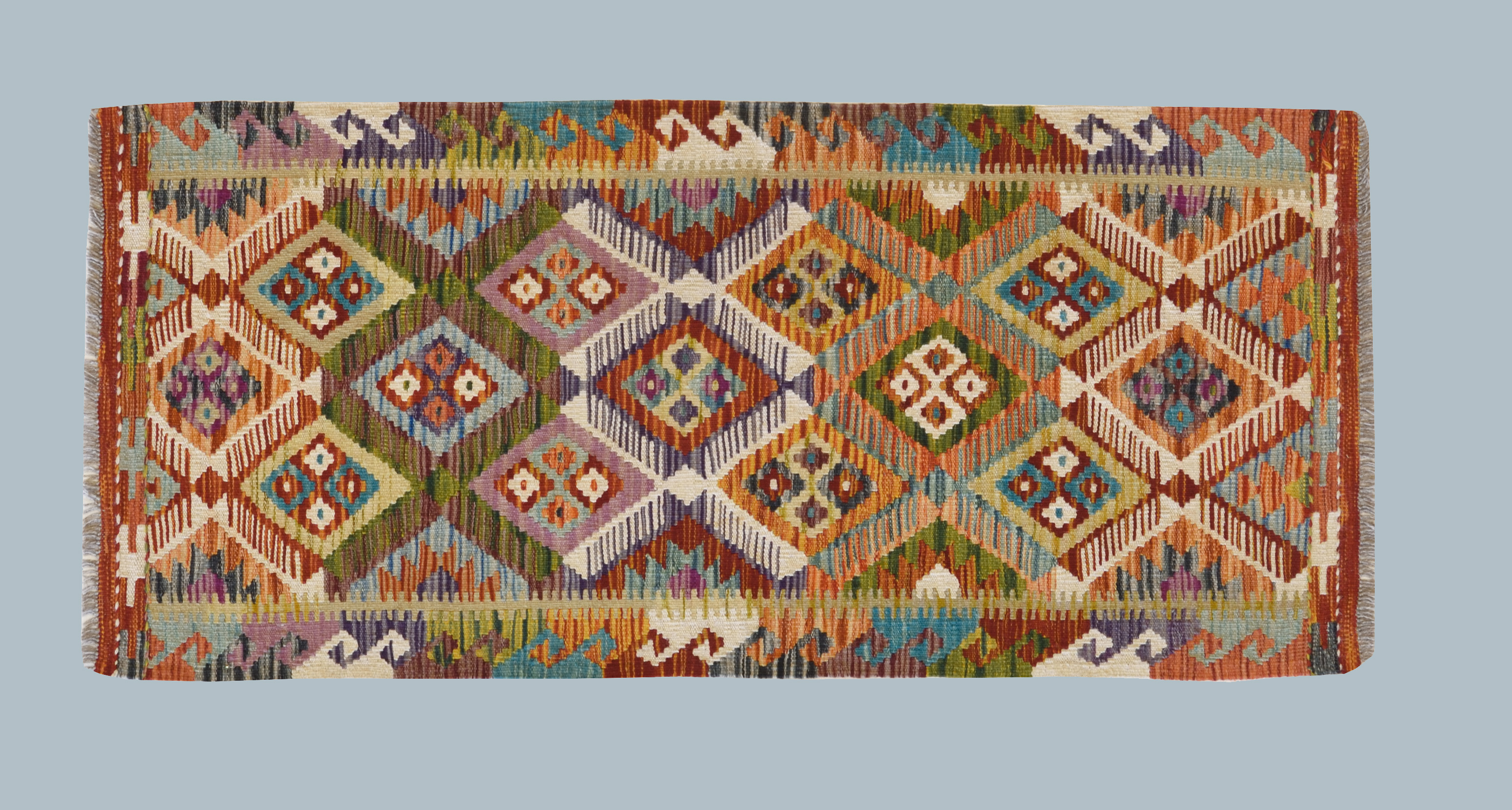 Elegante Kilim dalla forma allungata. Vi faccio notare i colori di fondo, verdi e arancione ottenuti con più tonalità accostate.