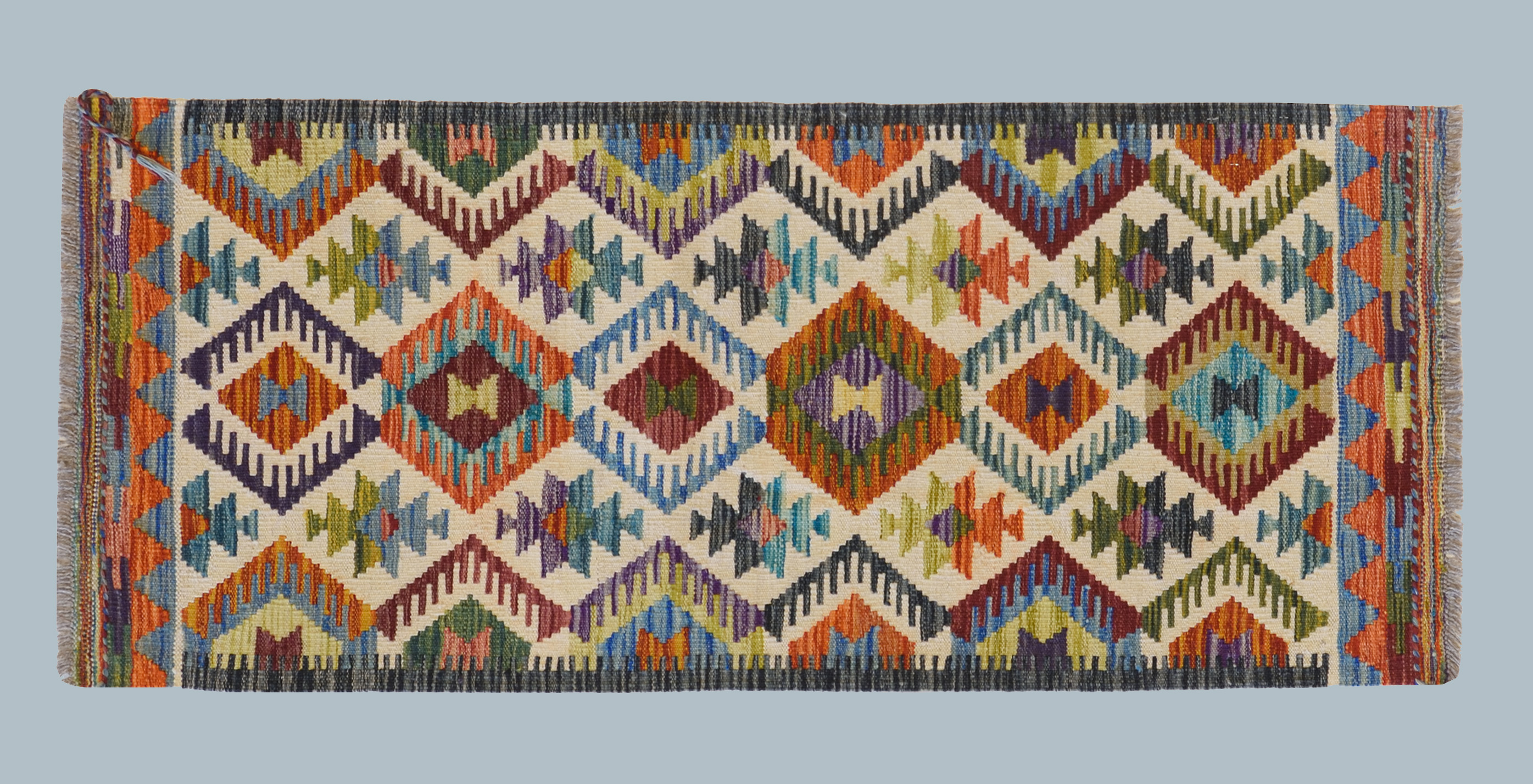 Intrecciati prevalentemente in Afganistan con nuovi colori vivaci o a pastello, riprendono tutti i motivi arcaici tramandati da secoli di generazione in generazione. I kilim nuovi sono una tessitura manuale piana realizzata con tecnica a stacchi; questa prevede che i fili di trama dello stesso colore passino sopra un ordito comune, lo avvolgano e tornino indietro lasciando una fessura che crea una separazione netta tra i blocchi di colore.I diversi blocchi danno origine a disegni geometrici, a questi motivi le tessitrici danno aspetto ornamentale o di talismani simbolici. Ad esempio, i motivi dei kilim nuovi noti con il nome di Elibelinde, sono una figura antropomorfica di dea, simbolo di nascita, spesso rappresentata in forma facilmente riconoscibile, addirittura a volte rappresentata con il figlio in grembo.I kilim nuovi con motivi Bukagi, passatoia per animali, Yin-yang (originari del lontano oriente), Su yolu acqua che corre, Muska amuleto contro il malocchio. Infinità di motivi combinati tra loro in modo fantasioso ed originale danno luogo a forme decorative e colori armonici che attraggono piacevolmente la nostra attenzione.I kilim nuovi appagando il nostro piacere estetico contemporaneo ci tramandano una storia secolare di comunicazione grafica ed una simbologia densa di significati. Ecco altri motivi tipici che anche in queste nuove manifatture ci tramandano una cultura secolare.Motivi ricorrenti nei Kilim nuovi: Cencel ad uncino, motivi a testa di uccello, a scorpione con motivo Akrep, motivi Yildiz, Agaci, Kus, Nazarlik, Kupe, Bukagi, sono inseriti tra le forme romboidali o a medaglione, in bordura o all'interno del campo del kilim.