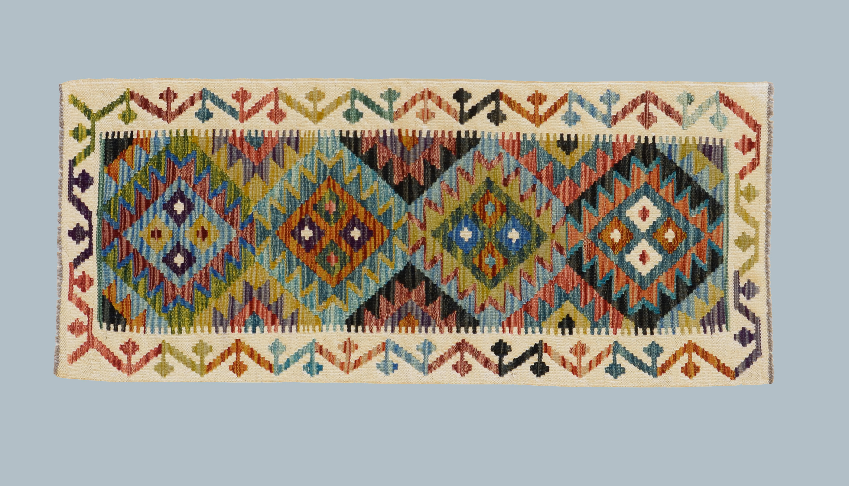 Intrecciati prevalentemente in Afganistan con nuovi colori vivaci o a pastello, riprendono tutti i motivi arcaici tramandati da secoli di generazione in generazione. I kilim nuovi sono una tessitura manuale piana realizzata con tecnica a stacchi; questa prevede che i fili di trama dello stesso colore passino sopra un ordito comune, lo avvolgano e tornino indietro lasciando una fessura che crea una separazione netta tra i blocchi di colore.I diversi blocchi danno origine a disegni geometrici, a questi motivi le tessitrici danno aspetto ornamentale o di talismani simbolici. Ad esempio, i motivi dei kilim nuovi noti con il nome di Elibelinde, sono una figura antropomorfica di dea, simbolo di nascita, spesso rappresentata in forma facilmente riconoscibile, addirittura a volte rappresentata con il figlio in grembo.I kilim nuovi con motivi Bukagi, passatoia per animali, Yin-yang (originari del lontano oriente), Su yolu acqua che corre, Muska amuleto contro il malocchio. Infinità di motivi combinati tra loro in modo fantasioso ed originale danno luogo a forme decorative e colori armonici che attraggono piacevolmente la nostra attenzione.I kilim nuovi appagando il nostro piacere estetico contemporaneo ci tramandano una storia secolare di comunicazione grafica ed una simbologia densa di significati. Ecco altri motivi tipici che anche in queste nuove manifatture ci tramandano una cultura secolare.Motivi ricorrenti nei Kilim nuovi: Cencel ad uncino, motivi a testa di uccello, a scorpione con motivo Akrep, motivi Yildiz, Agaci, Kus, Nazarlik, Kupe, Bukagi, sono inseriti tra le forme romboidali o a medaglione, in bordura o all'interno del campo del kilim.