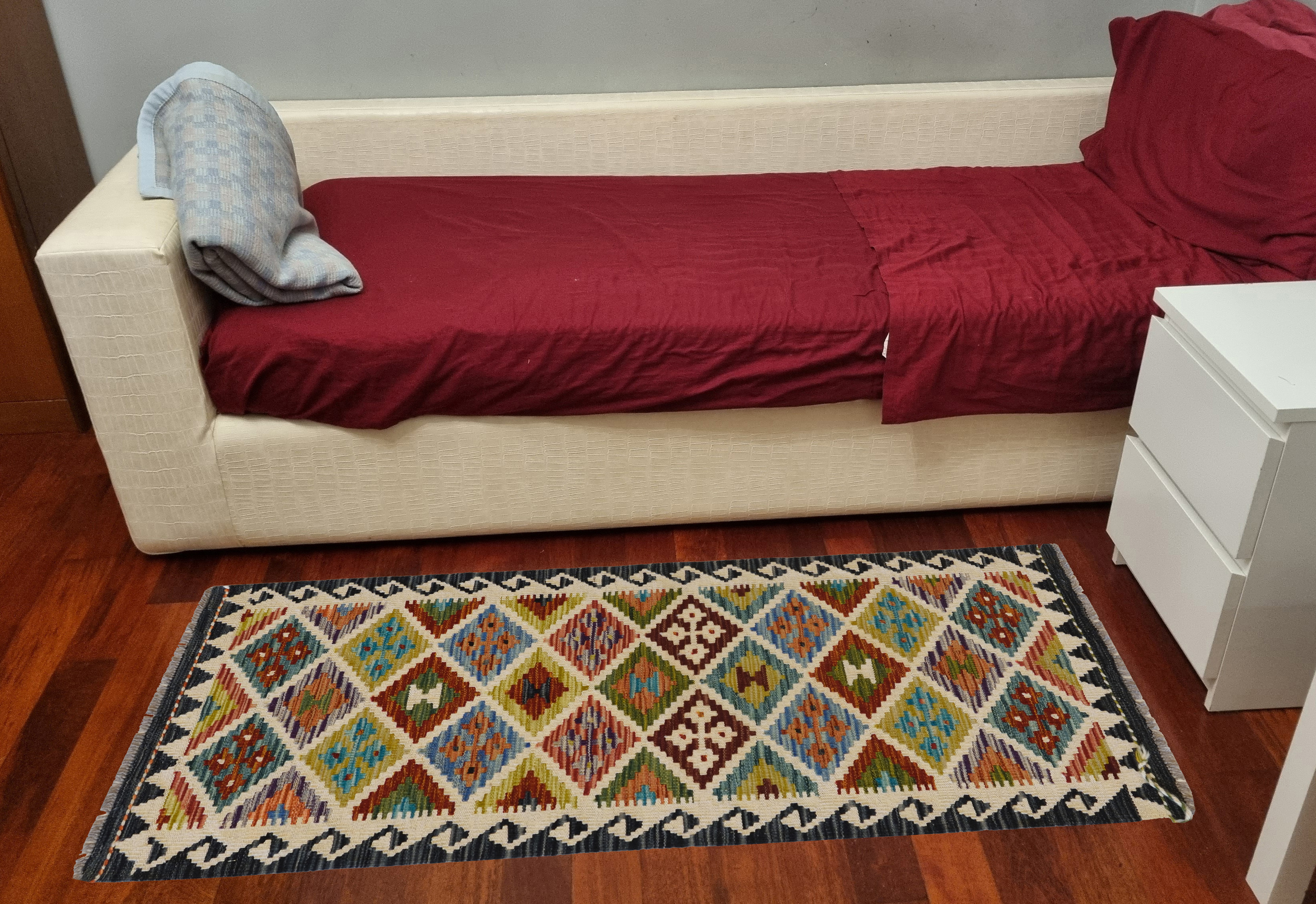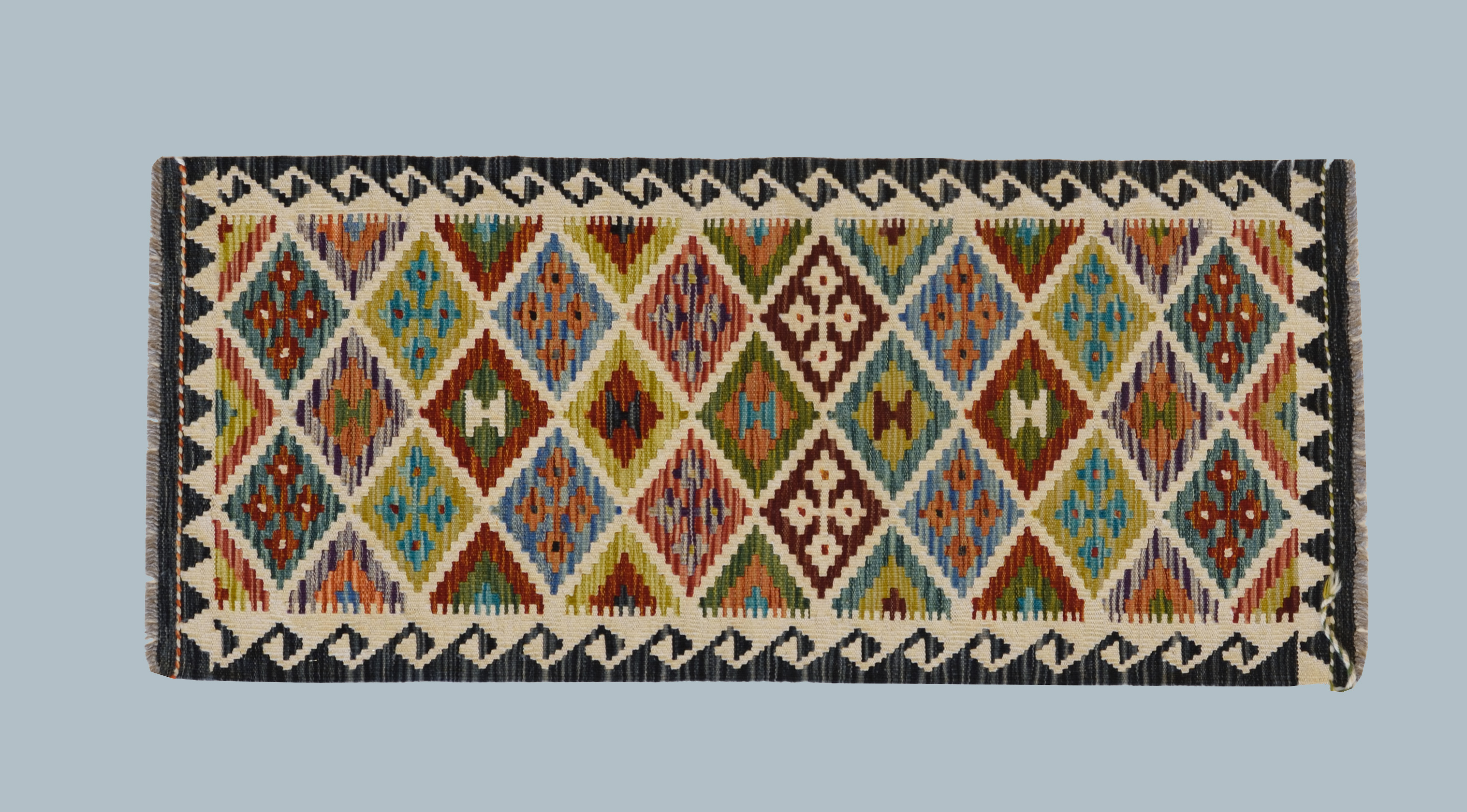 Formato a piccola passatoia, intrecciato a mano con lane dai colori vivaci, questo kilim afgano risulta fruibile in tanti piccoli spazi da ravvivare.