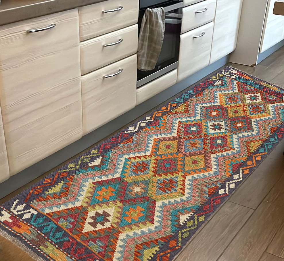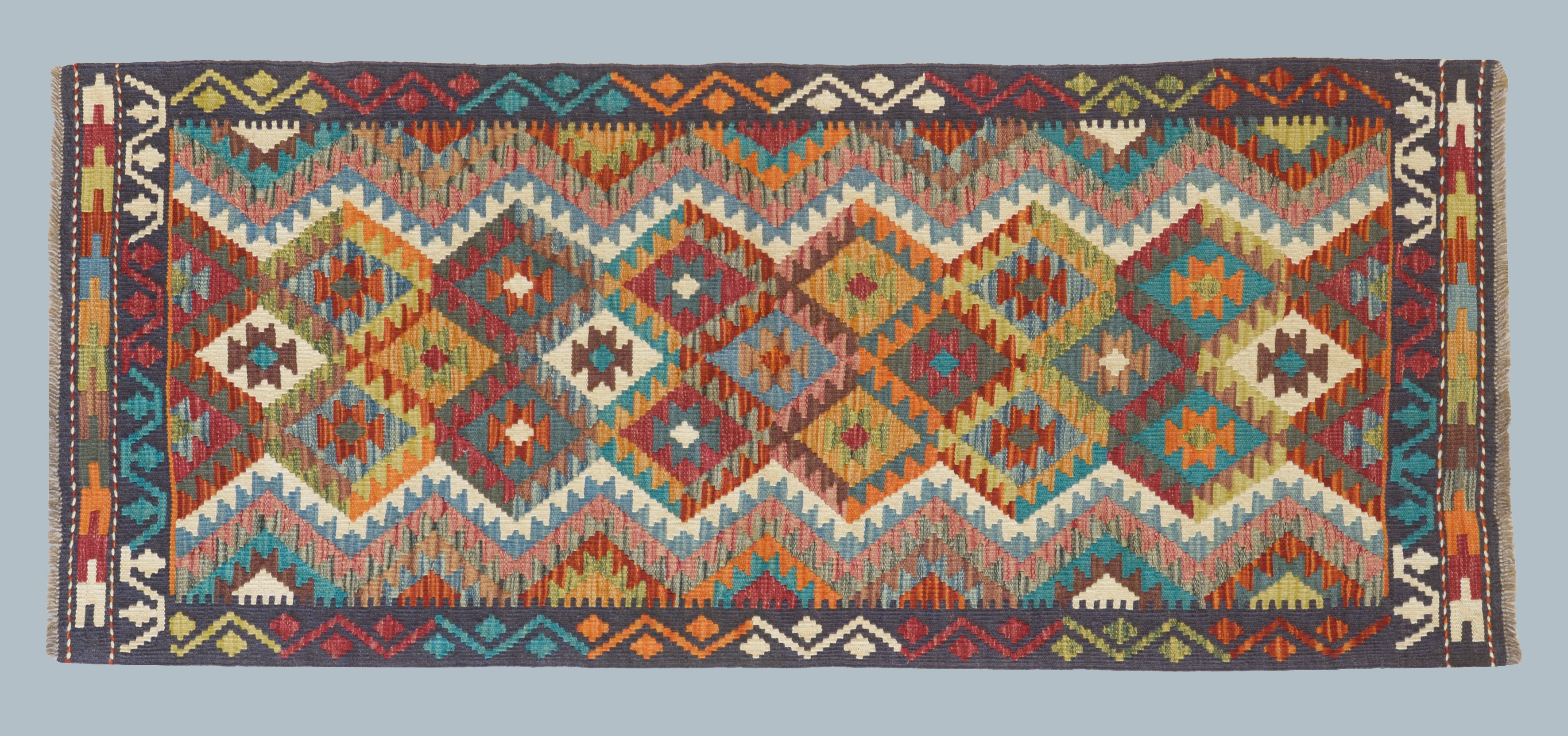 Intrecciati prevalentemente in Afganistan con nuovi colori vivaci o a pastello, riprendono tutti i motivi arcaici tramandati da secoli di generazione in generazione. I kilim nuovi sono una tessitura manuale piana realizzata con tecnica a stacchi; questa prevede che i fili di trama dello stesso colore passino sopra un ordito comune, lo avvolgano e tornino indietro lasciando una fessura che crea una separazione netta tra i blocchi di colore.I diversi blocchi danno origine a disegni geometrici, a questi motivi le tessitrici danno aspetto ornamentale o di talismani simbolici. Ad esempio, i motivi dei kilim nuovi noti con il nome di Elibelinde, sono una figura antropomorfica di dea, simbolo di nascita, spesso rappresentata in forma facilmente riconoscibile, addirittura a volte rappresentata con il figlio in grembo.I kilim nuovi con motivi Bukagi, passatoia per animali, Yin-yang (originari del lontano oriente), Su yolu acqua che corre, Muska amuleto contro il malocchio. Infinità di motivi combinati tra loro in modo fantasioso ed originale danno luogo a forme decorative e colori armonici che attraggono piacevolmente la nostra attenzione.I kilim nuovi appagando il nostro piacere estetico contemporaneo ci tramandano una storia secolare di comunicazione grafica ed una simbologia densa di significati. Ecco altri motivi tipici che anche in queste nuove manifatture ci tramandano una cultura secolare.Motivi ricorrenti nei Kilim nuovi: Cencel ad uncino, motivi a testa di uccello, a scorpione con motivo Akrep, motivi Yildiz, Agaci, Kus, Nazarlik, Kupe, Bukagi, sono inseriti tra le forme romboidali o a medaglione, in bordura o all'interno del campo del kilim.