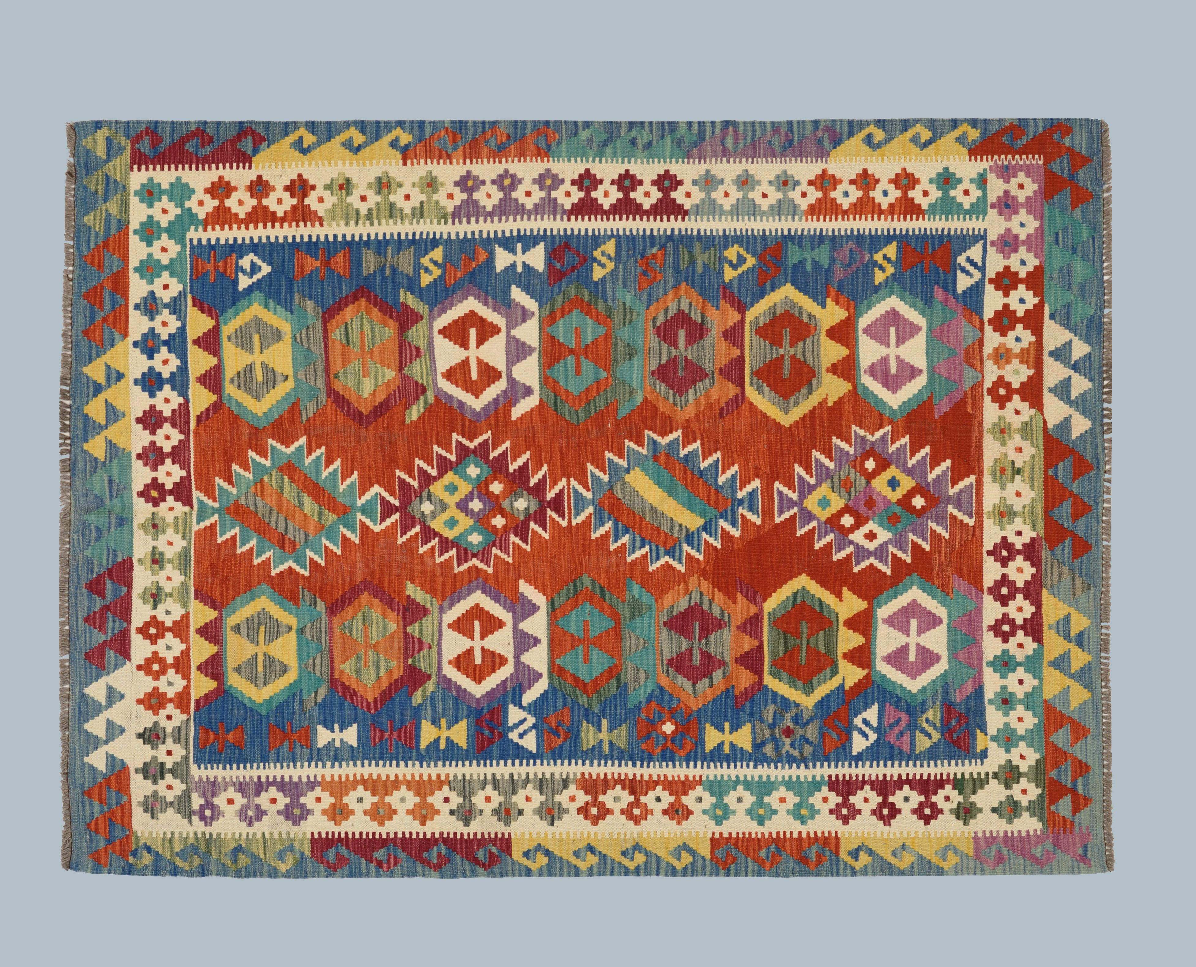 Intrecciati prevalentemente in Afganistan con nuovi colori vivaci o a pastello, riprendono tutti i motivi arcaici tramandati da secoli di generazione in generazione. I kilim nuovi sono una tessitura manuale piana realizzata con tecnica a stacchi; questa prevede che i fili di trama dello stesso colore passino sopra un ordito comune, lo avvolgano e tornino indietro lasciando una fessura che crea una separazione netta tra i blocchi di colore.I diversi blocchi danno origine a disegni geometrici, a questi motivi le tessitrici danno aspetto ornamentale o di talismani simbolici. Ad esempio, i motivi dei kilim nuovi noti con il nome di Elibelinde, sono una figura antropomorfica di dea, simbolo di nascita, spesso rappresentata in forma facilmente riconoscibile, addirittura a volte rappresentata con il figlio in grembo.I kilim nuovi con motivi Bukagi, passatoia per animali, Yin-yang (originari del lontano oriente), Su yolu acqua che corre, Muska amuleto contro il malocchio. Infinità di motivi combinati tra loro in modo fantasioso ed originale danno luogo a forme decorative e colori armonici che attraggono piacevolmente la nostra attenzione.I kilim nuovi appagando il nostro piacere estetico contemporaneo ci tramandano una storia secolare di comunicazione grafica ed una simbologia densa di significati. Ecco altri motivi tipici che anche in queste nuove manifatture ci tramandano una cultura secolare.Motivi ricorrenti nei Kilim nuovi: Cencel ad uncino, motivi a testa di uccello, a scorpione con motivo Akrep, motivi Yildiz, Agaci, Kus, Nazarlik, Kupe, Bukagi, sono inseriti tra le forme romboidali o a medaglione, in bordura o all'interno del campo del kilim.