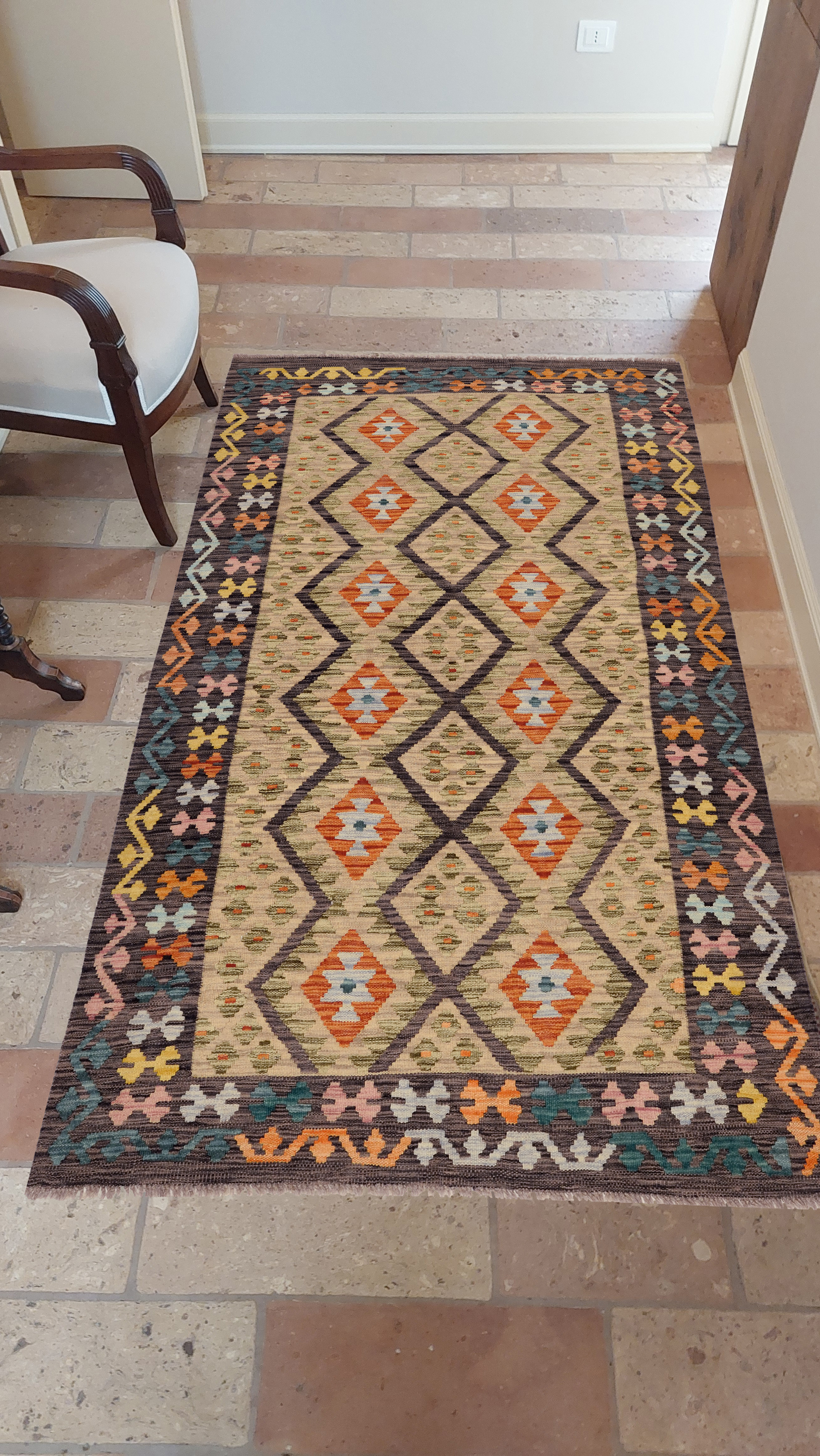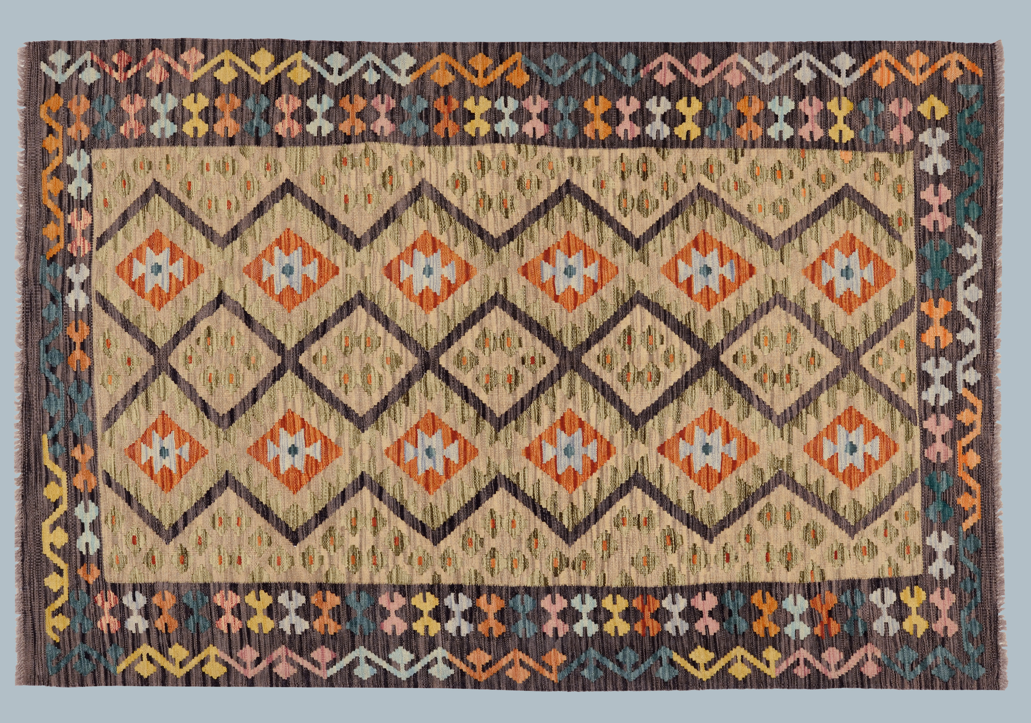 Intrecciati prevalentemente in Afganistan con nuovi colori vivaci o a pastello, riprendono tutti i motivi arcaici tramandati da secoli di generazione in generazione. I kilim nuovi sono una tessitura manuale piana realizzata con tecnica a stacchi; questa prevede che i fili di trama dello stesso colore passino sopra un ordito comune, lo avvolgano e tornino indietro lasciando una fessura che crea una separazione netta tra i blocchi di colore.I diversi blocchi danno origine a disegni geometrici, a questi motivi le tessitrici danno aspetto ornamentale o di talismani simbolici. Ad esempio, i motivi dei kilim nuovi noti con il nome di Elibelinde, sono una figura antropomorfica di dea, simbolo di nascita, spesso rappresentata in forma facilmente riconoscibile, addirittura a volte rappresentata con il figlio in grembo.I kilim nuovi con motivi Bukagi, passatoia per animali, Yin-yang (originari del lontano oriente), Su yolu acqua che corre, Muska amuleto contro il malocchio. Infinità di motivi combinati tra loro in modo fantasioso ed originale danno luogo a forme decorative e colori armonici che attraggono piacevolmente la nostra attenzione.I kilim nuovi appagando il nostro piacere estetico contemporaneo ci tramandano una storia secolare di comunicazione grafica ed una simbologia densa di significati. Ecco altri motivi tipici che anche in queste nuove manifatture ci tramandano una cultura secolare.Motivi ricorrenti nei Kilim nuovi: Cencel ad uncino, motivi a testa di uccello, a scorpione con motivo Akrep, motivi Yildiz, Agaci, Kus, Nazarlik, Kupe, Bukagi, sono inseriti tra le forme romboidali o a medaglione, in bordura o all'interno del campo del kilim.