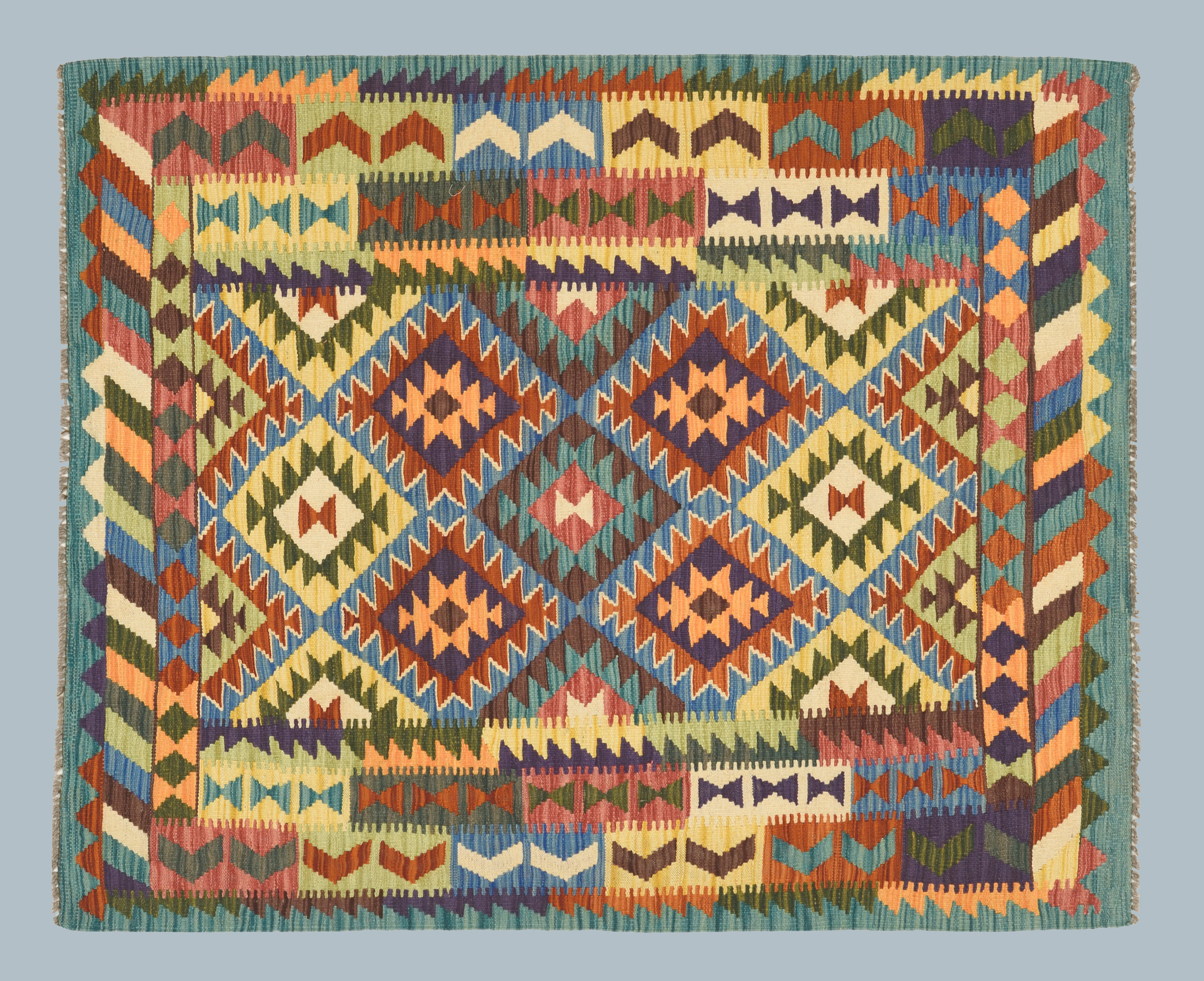 Intrecciati prevalentemente in Afganistan con nuovi colori vivaci o a pastello, riprendono tutti i motivi arcaici tramandati da secoli di generazione in generazione. I kilim nuovi sono una tessitura manuale piana realizzata con tecnica a stacchi; questa prevede che i fili di trama dello stesso colore passino sopra un ordito comune, lo avvolgano e tornino indietro lasciando una fessura che crea una separazione netta tra i blocchi di colore.I diversi blocchi danno origine a disegni geometrici, a questi motivi le tessitrici danno aspetto ornamentale o di talismani simbolici. Ad esempio, i motivi dei kilim nuovi noti con il nome di Elibelinde, sono una figura antropomorfica di dea, simbolo di nascita, spesso rappresentata in forma facilmente riconoscibile, addirittura a volte rappresentata con il figlio in grembo.I kilim nuovi con motivi Bukagi, passatoia per animali, Yin-yang (originari del lontano oriente), Su yolu acqua che corre, Muska amuleto contro il malocchio. Infinità di motivi combinati tra loro in modo fantasioso ed originale danno luogo a forme decorative e colori armonici che attraggono piacevolmente la nostra attenzione.I kilim nuovi appagando il nostro piacere estetico contemporaneo ci tramandano una storia secolare di comunicazione grafica ed una simbologia densa di significati. Ecco altri motivi tipici che anche in queste nuove manifatture ci tramandano una cultura secolare.Motivi ricorrenti nei Kilim nuovi: Cencel ad uncino, motivi a testa di uccello, a scorpione con motivo Akrep, motivi Yildiz, Agaci, Kus, Nazarlik, Kupe, Bukagi, sono inseriti tra le forme romboidali o a medaglione, in bordura o all'interno del campo del kilim.